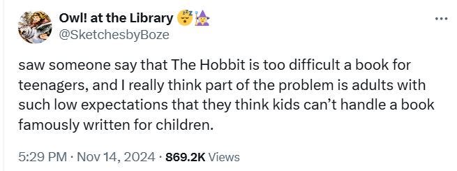I was never an academic child, but by around the age of 9 or 10 I had read the Hobbit, but now apparently it is too difficult for someone several years older.